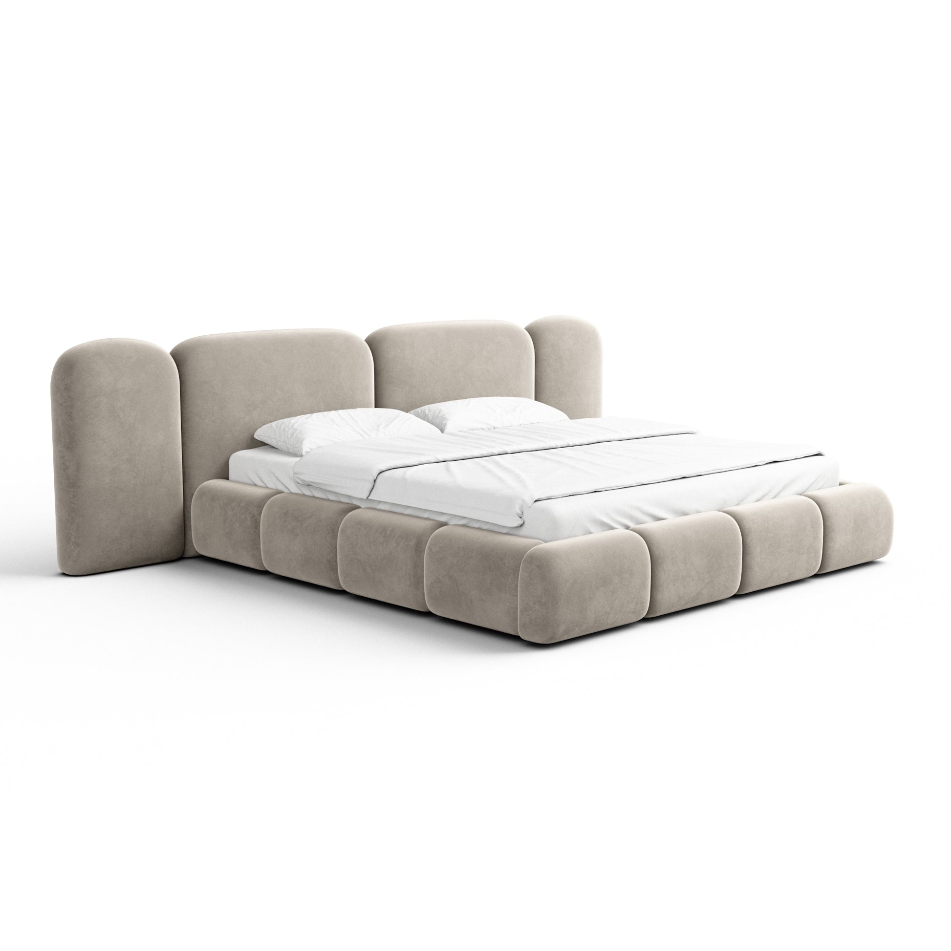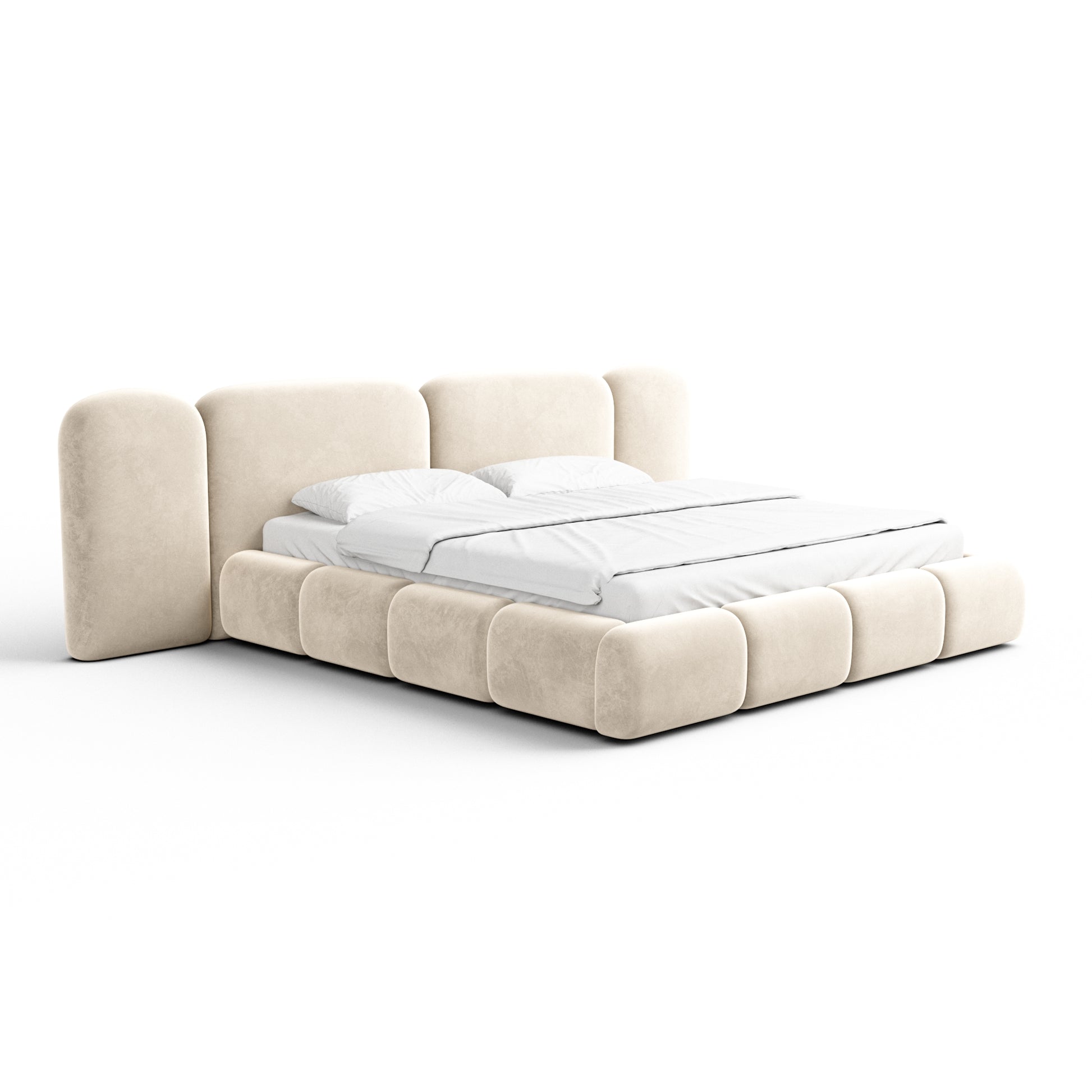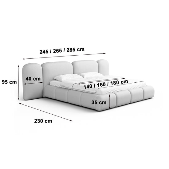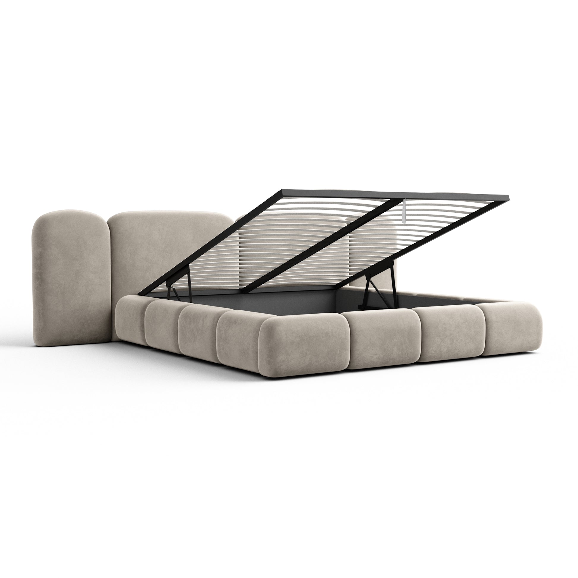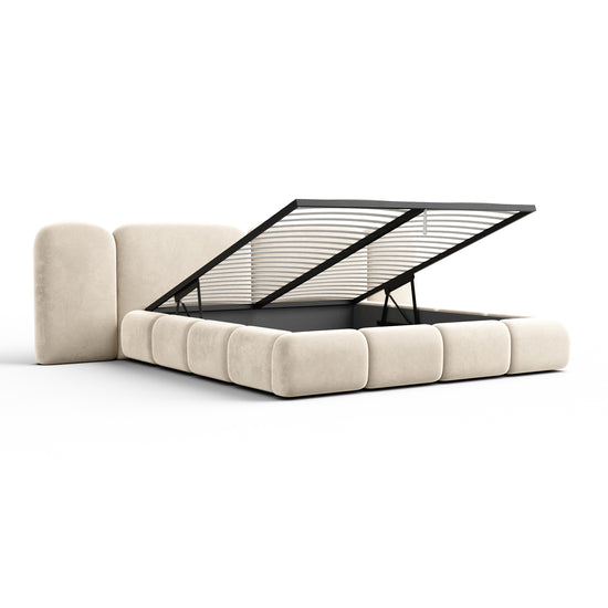 The BOCINA Bed, featuring an integrated lift-up slatted frame with built-in storage, combines modern elegance with soft, inviting comfort to create a timeless centerpiece for any bedroom. Its clean lines and refined upholstered design bring harmony, practicality, and style to your space.