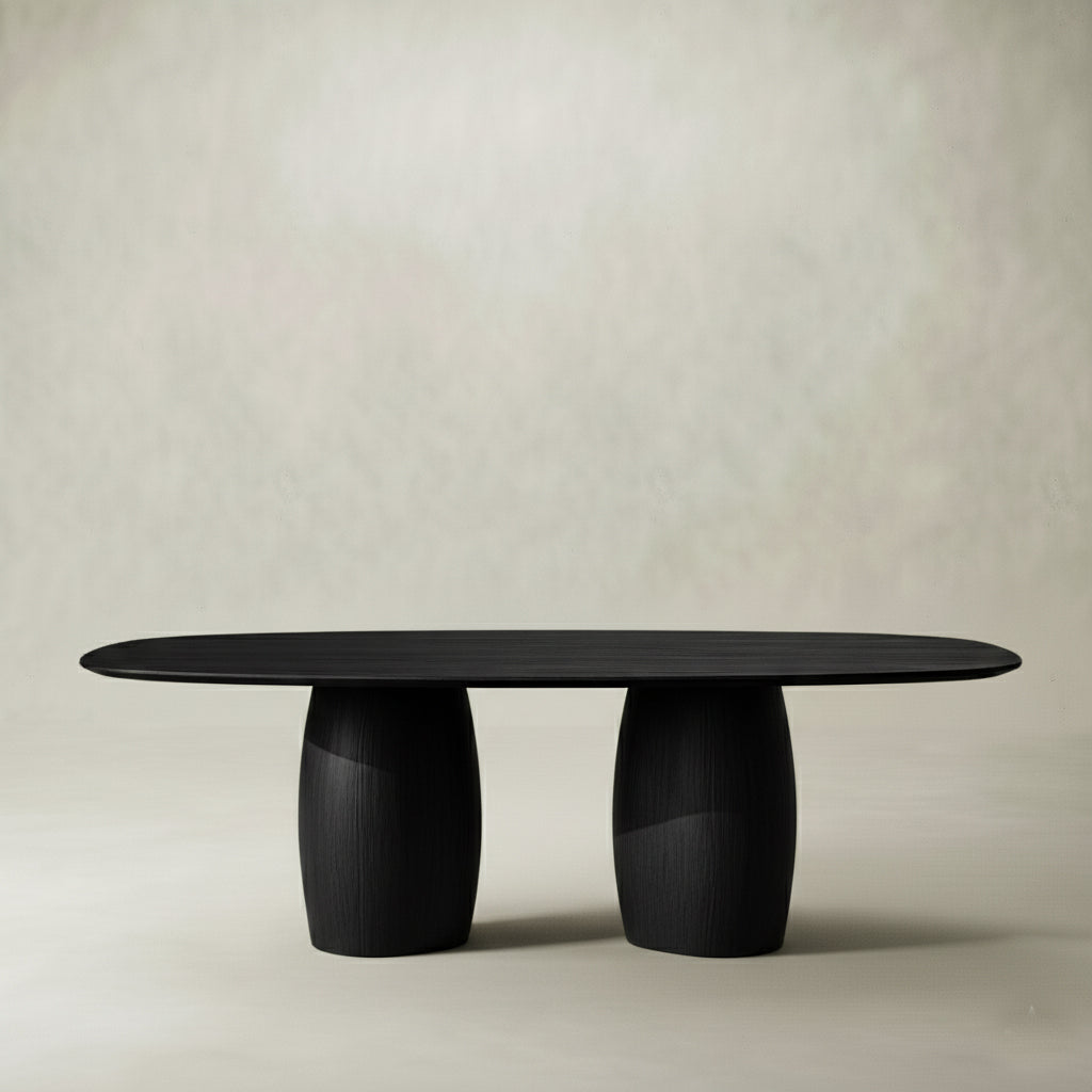 The BRIONI Dining Table features an oak veneer finish and an elegant, organic shape, creating a warm and modern centerpiece for any dining space. Its flowing lines and minimalist design bring harmony and understated elegance to your home.
